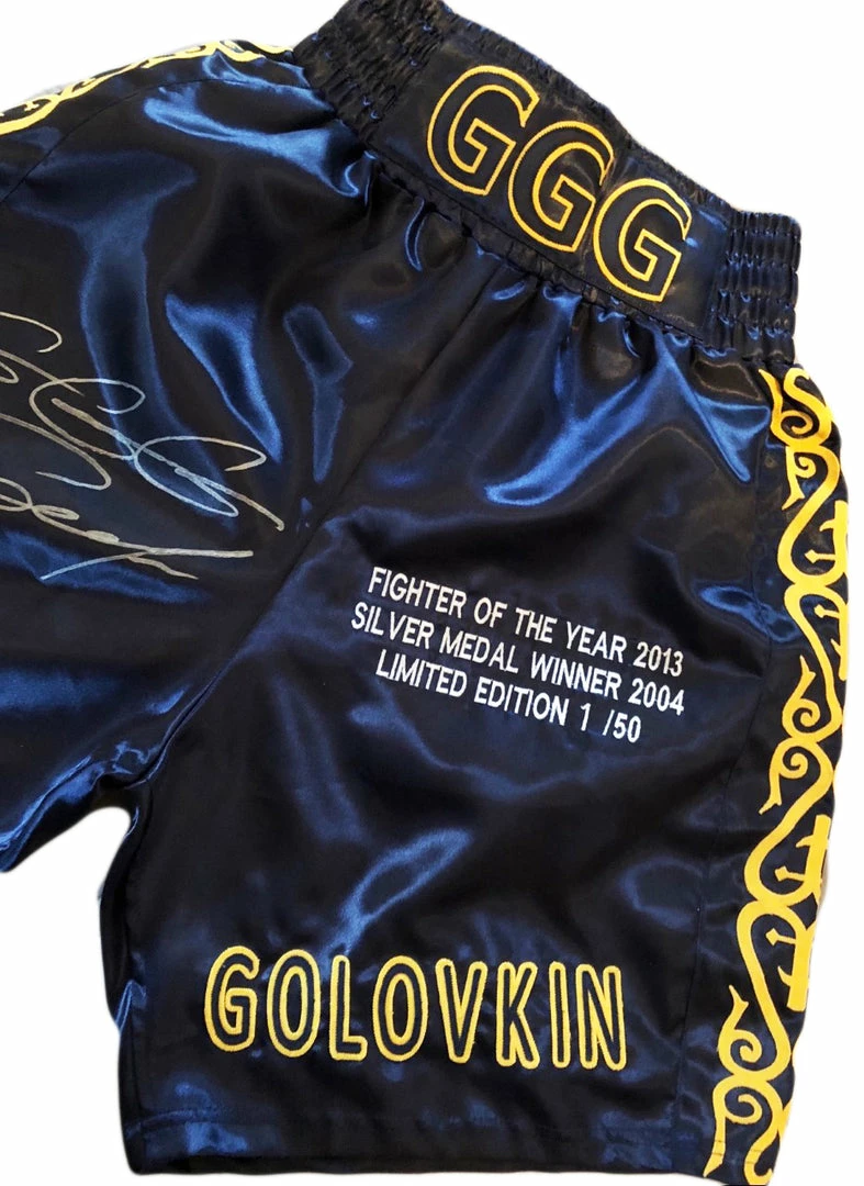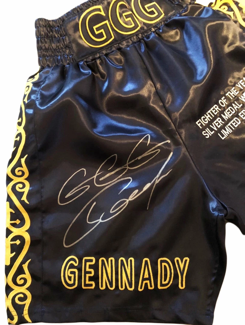 Iconsofboxing.com Autographed Gennady Golovkin Triple GGG Custom Print Boxing Trunks BOXING MEMORABILIA