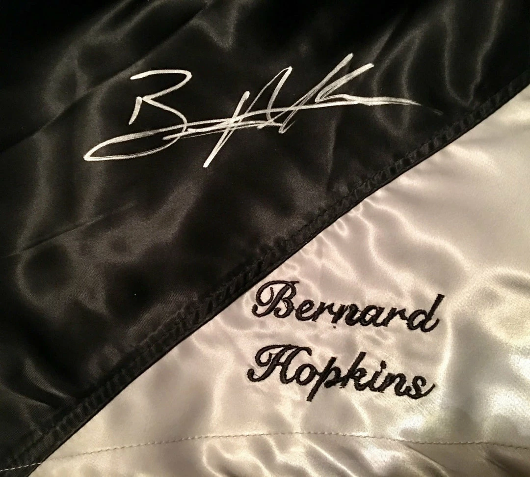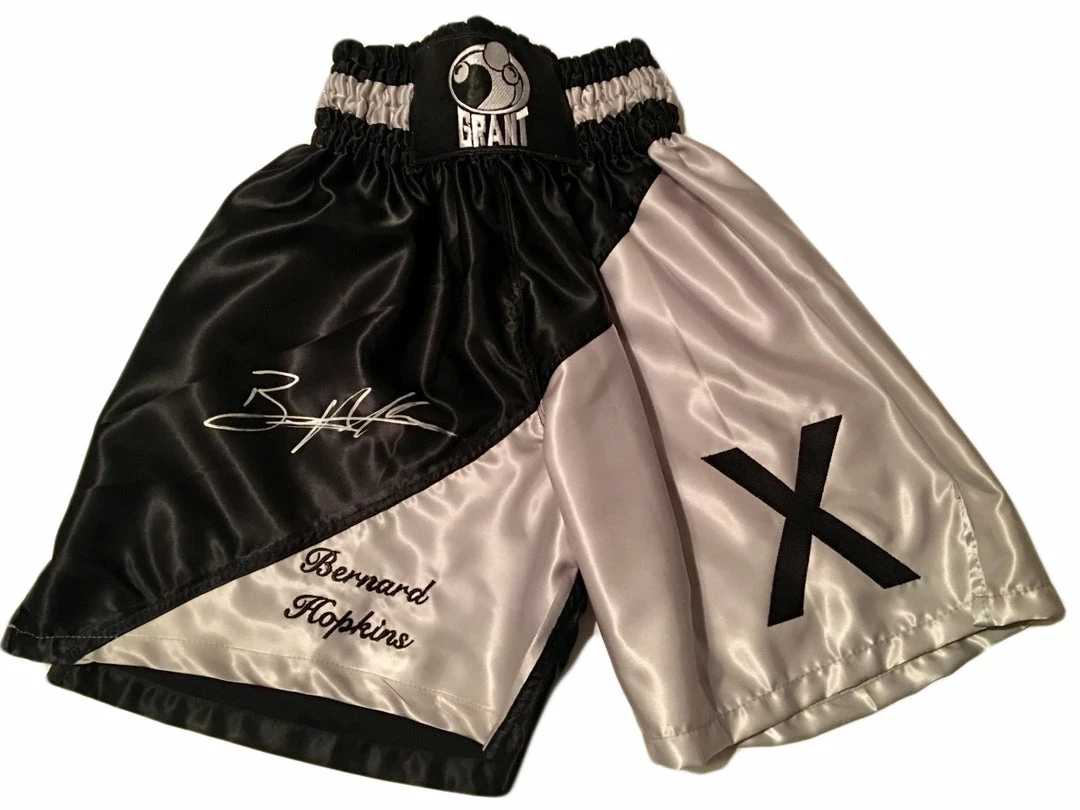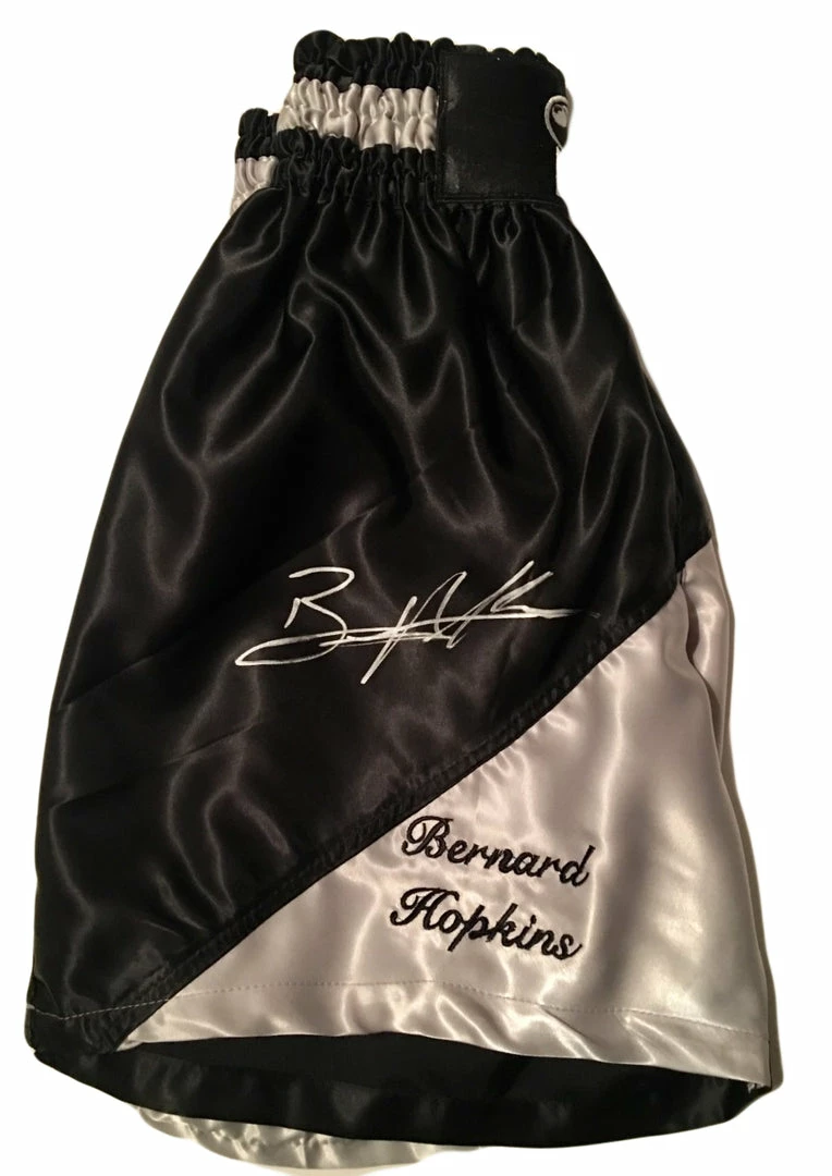 Iconsofboxing.com BOXING MEMORABILIA Bernard Hopkins Silver Autographed Custom Made Black/silver Boxing Trunks
