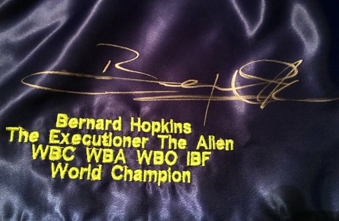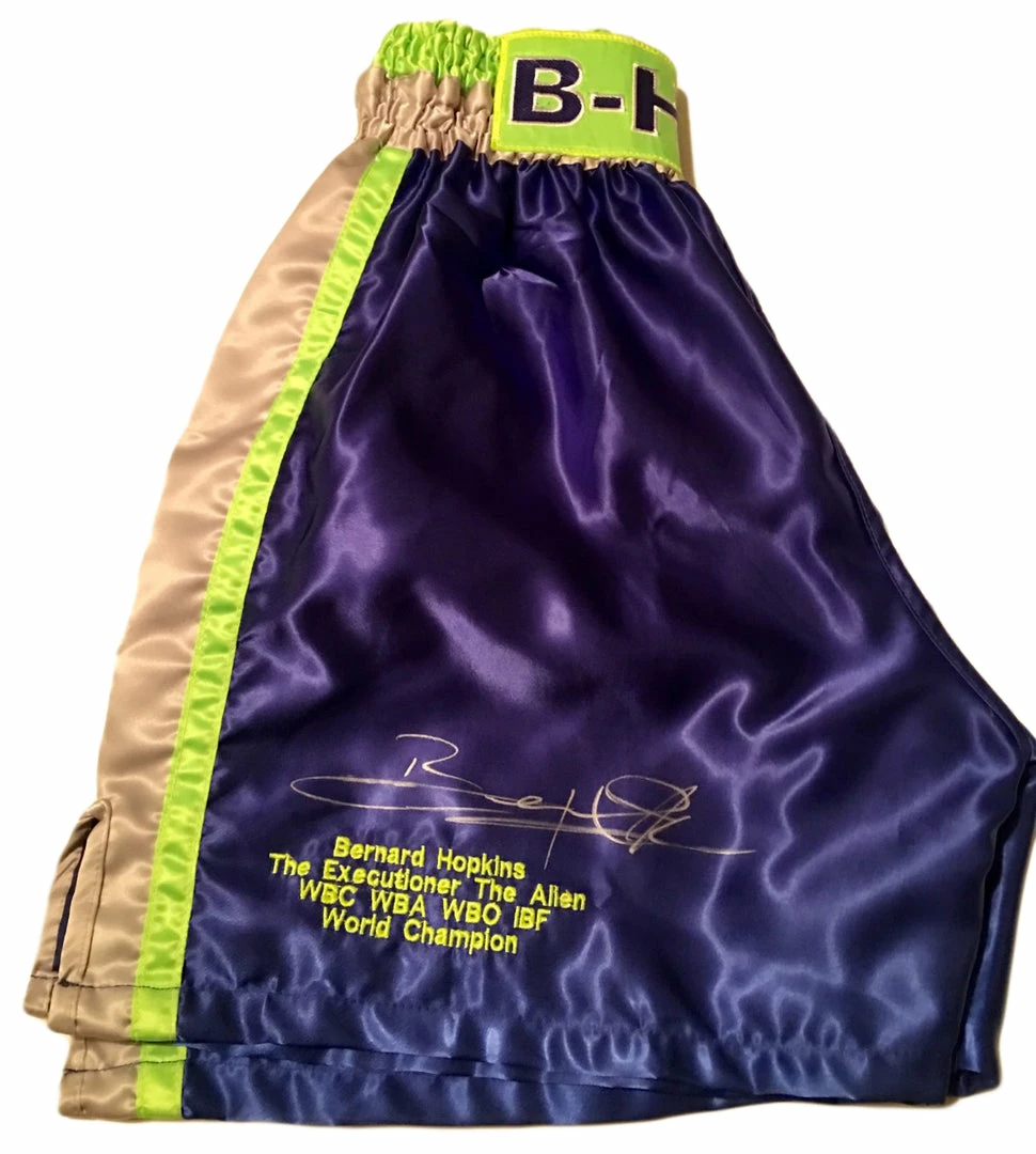 Bernard Hopkins Custom Boxing Trunks has been personally signed by The Alien, Executioner Bernard Hopkins on a purple and green colored Custom Hand Made Trunks Exactly like the ones he fought with. Signed In Silver Marker. Autographs Comes fully certified and tamper-evident hologram. Also backed by iconsofboxing.com Authenticity Guarantee.