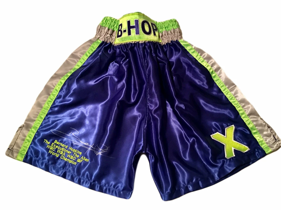 Iconsofboxing.com BOXING MEMORABILIA Bernard Hopkins Silver Autographed Custom Made Green/purple Boxing Trunks