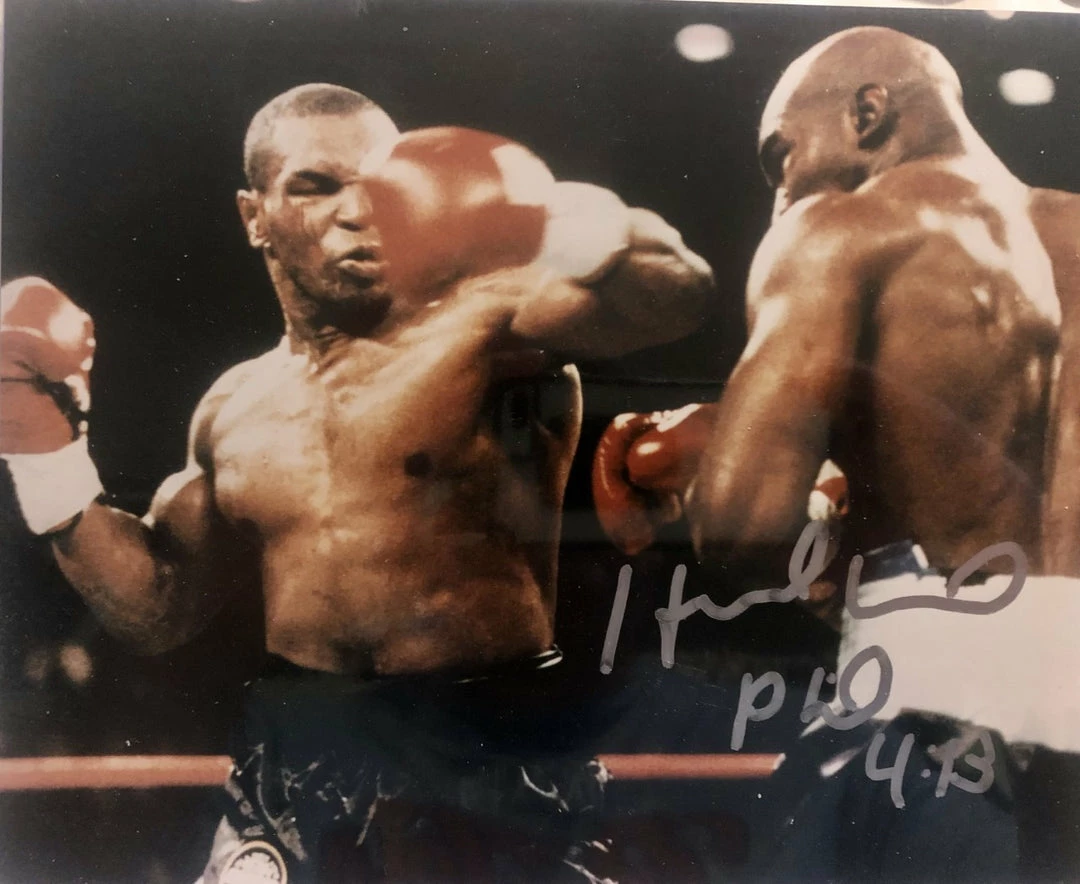 The Real Deal Evander Holyfield Hand signed Rare 8×10 size photo vs Mike Tyson. Comes fully certified with Certificate of Authenticity and tamper-evident hologram. Also backed by iconsofboxing.com Authenticity Guarantee.
