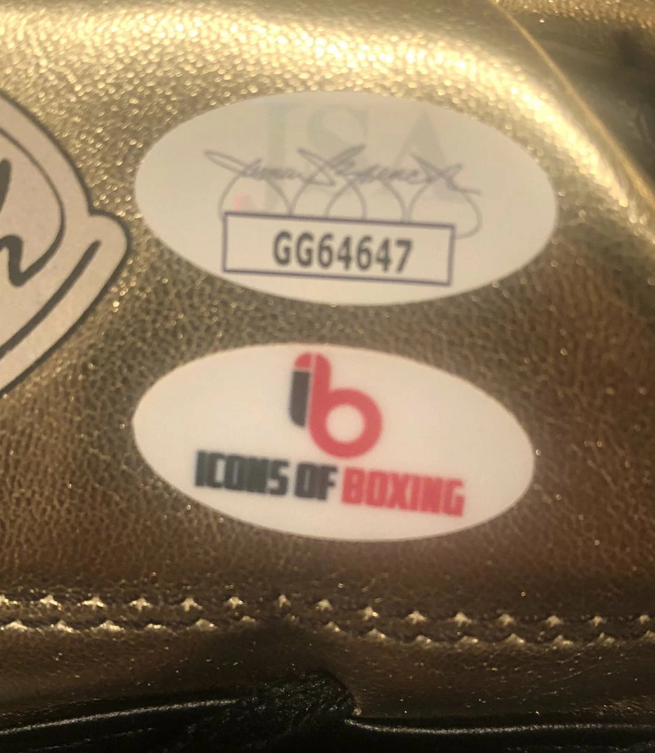 This Rare Color Gold Triple GGG Boxing Gloves has been personally signed by Gennady Golovkin. Signed In A Bold Black Marker. Autographs Comes fully certified tamper-evident hologram. Also backed by iconsofboxing.com Authenticity Guarantee. JSA