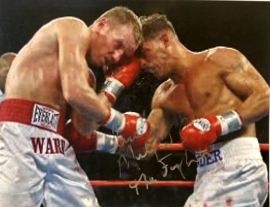 Micky Ward Autographed 8×10 boxing photo for sale. Inscribed “The Fighter” Its a collectors must have! Signed in a silver Marker. Photo of Micky Ward fighting Arturo Gatti. All our Boxing memorabilia comes 100% authenticated and certified! Backed by www.iconsofboxing.com lifetime guarantee.