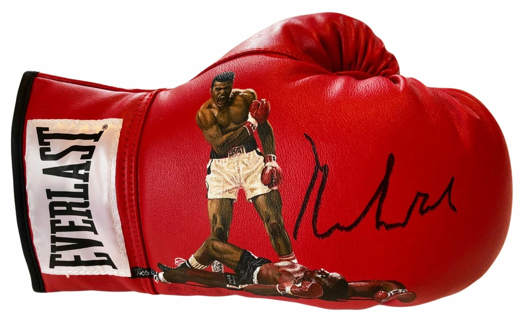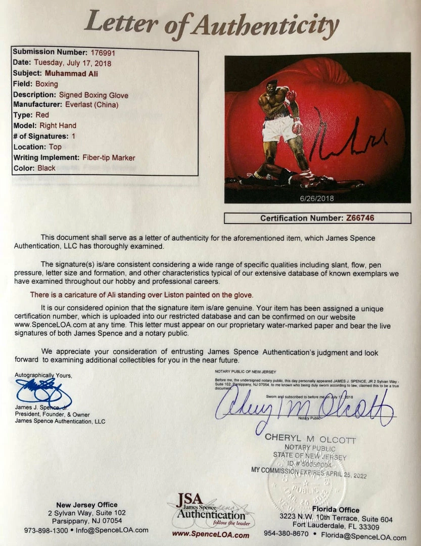 Autographed Muhammad Ali in Black ink and a Painted Muhammad Ali over Sonny Liston on the front of a Everlast of Boxing Glove. Painted by famous sports memorabilia painter Ken Branch. This Glove has been personally hand-signed by Muhammad Ali. Autographs Comes fully authenticated with JSA Certificate of Authenticity Full LOA. and tamper-evident hologram. Also backed by iconsofboxing.com Authenticity Guarantee.
