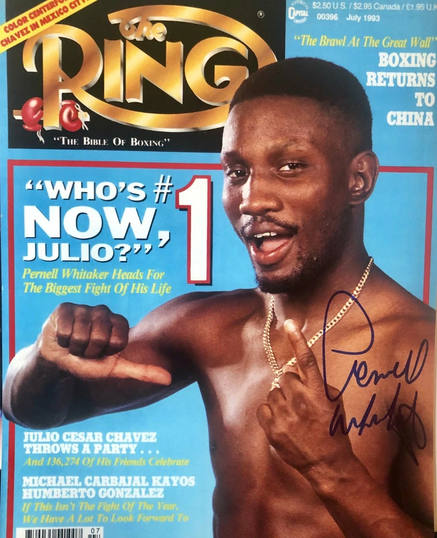 Pernell Whitaker Signed 8×10 Photo of the Champ on the Ring Magazine Cover. Photo measures 8” x 10” in size and has been hand-signed in Blue Marker by Pernell Whitaker.
