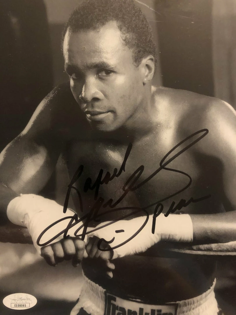 Photo measures 8″ x 10″ in size and has been hand-signed in black felt-tip pen by Sugar Ray Leonard (HOF).