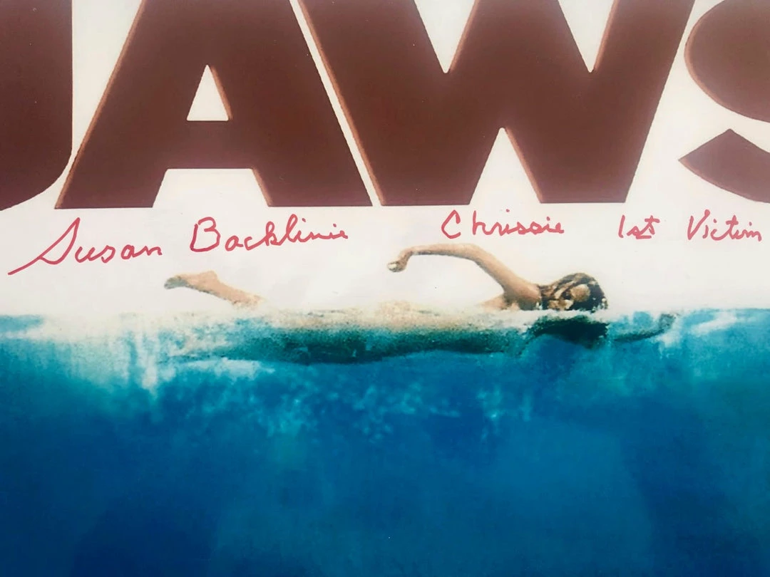 The poster measures 11″ x 17″ in size and has been hand-signed and inscribed in blue felt-tip pen pen by Susan Backlinie (Chrissie Watkins). This is the exact item you will receive will be of the one pictured.