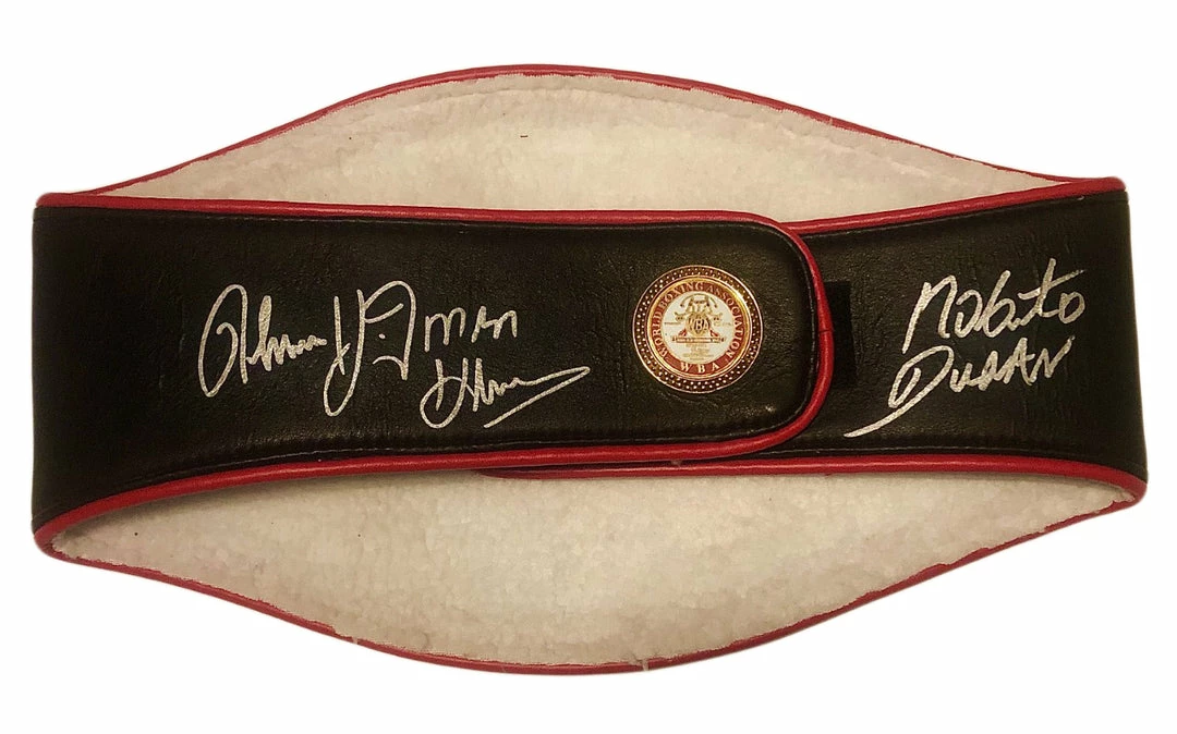 World Boxing Association replica belt measures approximately 49″ in size and has been hand-signed in silver paint-pen by Thomas Hearns and Roberto Duran.