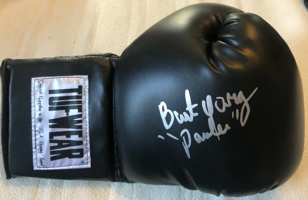 Burt Young Autographed TUFFWEAR Black Boxing Glove Inscribed “Paulie” in Silver. Autographed in person. Glove has been hand-signed Burt Young and also inscribed “Paulie” in silver felt-tip pen by Burt Young (Paulie). In person signing.