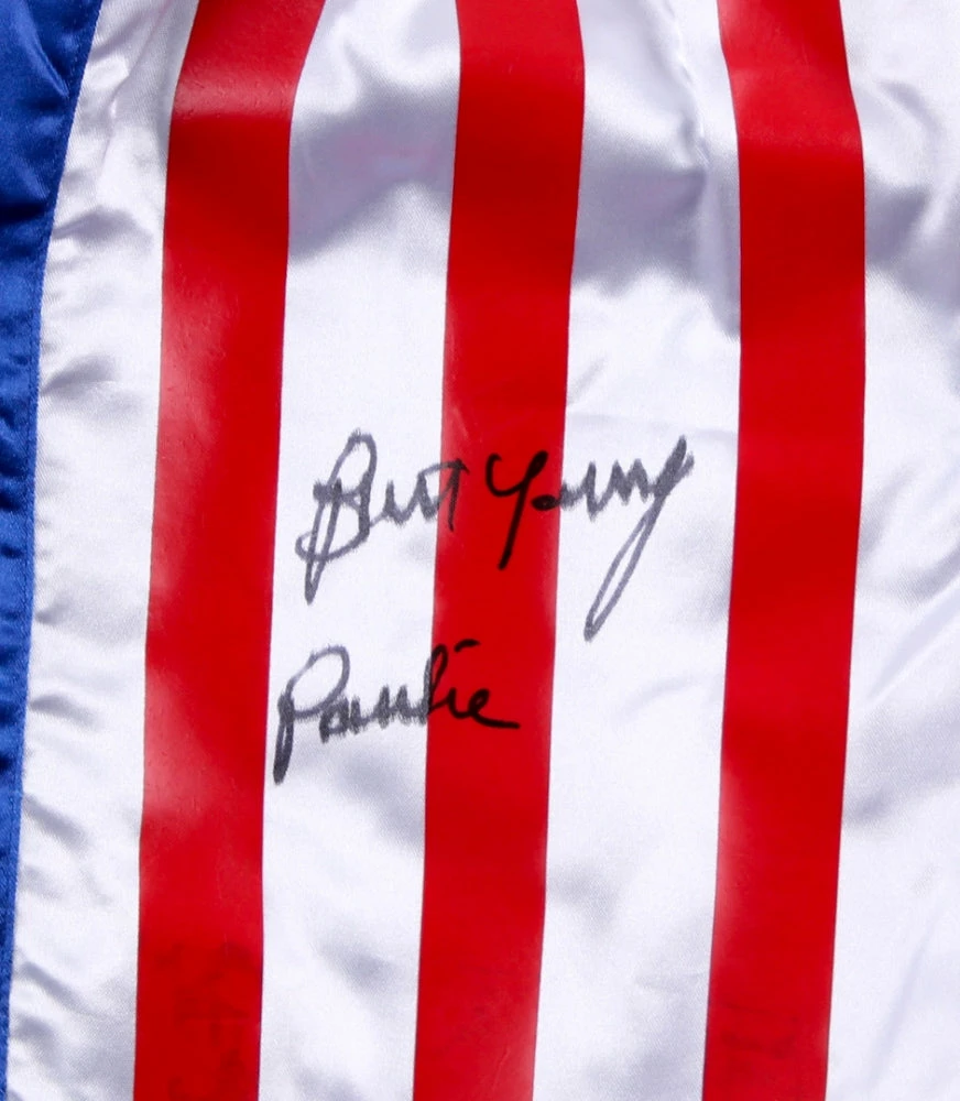 Custom boxing trunks have been hand-signed and inscribed in black felt-tip pen by Burt Young (Paulie). This is a stock item and stock images may be used in this listing. The exact item you will receive will be of equal quality to the one pictured.