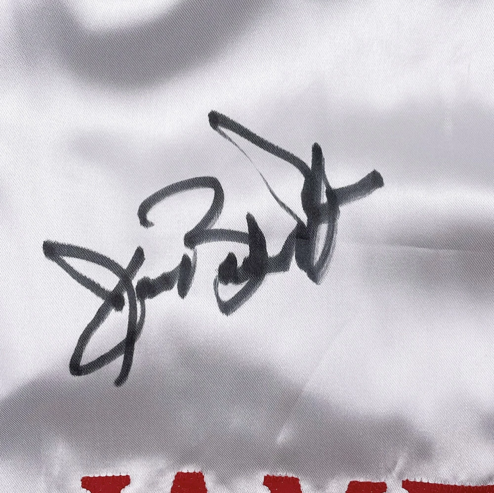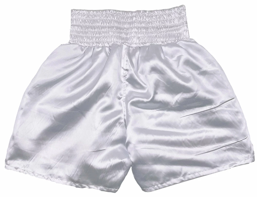 Custom boxing shorts have been hand-signed by Buster Douglas.