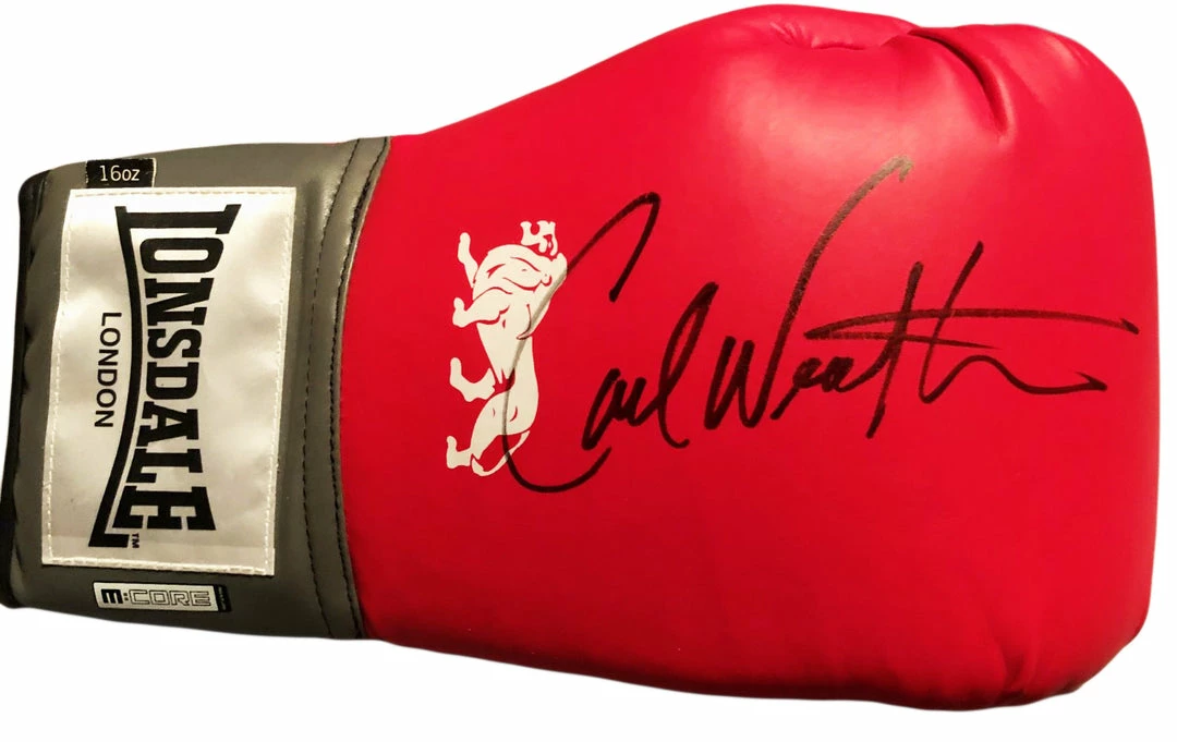 Carl Weathers Autographed Rare U.K Boxing Glove Inscribed “Apollo Creed” Autographed in person. Glove has been hand-signed and also inscribed in black felt-tip pen by Carl Weathers (Apollo Creed).