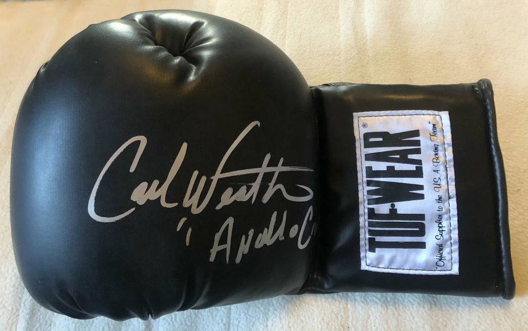 Carl Weathers Autographed TUFFWEAR black Boxing Glove Inscribed “Apollo Creed” Autographed in person. Glove has been hand-signed and also inscribed in silver felt-tip pen by Carl Weathers (Apollo Creed).