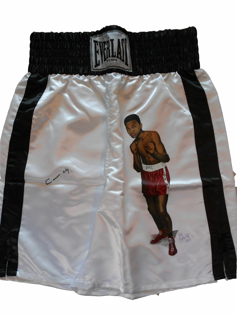 Autographed Cassius Clay in Black ink and Painted a young Cassius Clay Muhammad Ali on the front of a Everlast set of Boxing Trunks. Painted by famous sports memorabilia painter Ken Branch. These Trunks has been personally hand-signed by Muhammad Ali. Autographs Comes fully authenticated with Certificate of Authenticity and tamper-evident hologram. Also backed by iconsofboxing.com Authenticity Guarantee.