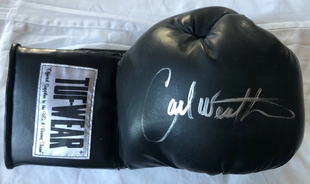 Carl Weathers Autographed TUFFWEAR black Boxing Glove “Apollo Creed” Autographed in person. Glove has been hand-signed and also inscribed in silver felt-tip pen by Carl Weathers (Apollo Creed).