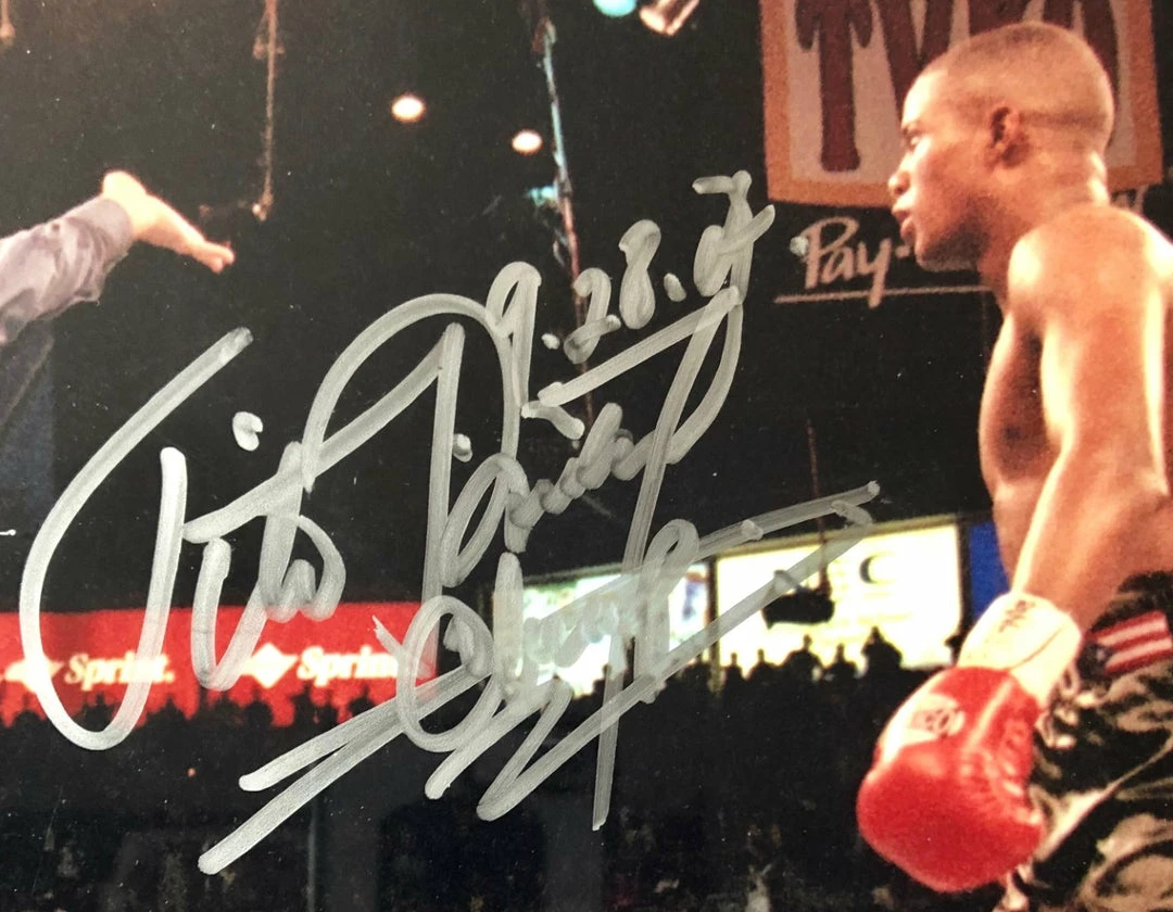 Félix Juan Trinidad García, popularly known as “Tito” Trinidad, is a Puerto Rican former professional boxer who competed from 1990 to 2008. He held multiple world championships in three weight classes, and is considered one of the best boxers in Puerto Rico’s history. This Beautiful shot is Framed and inscribed Champion and signed in silver signature!