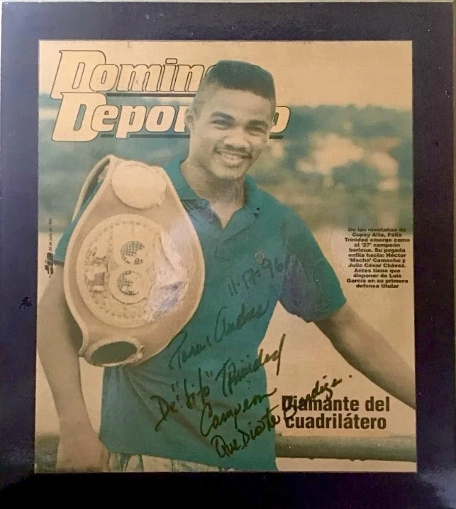 Felix “Tito” Trinidad signed Black 13×16 Mounted autographed Boxing Photo Vintage. This isΒ a color Beautiful photo signed by Tito Trinidad. He signed this photo with a black sharpie. This autograph is authenticated and comes with matching sticker and certification.