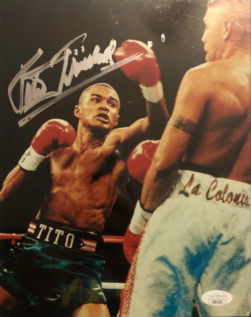 Felix “Tito” Trinidad signed autographed 8×10 Boxing Photo JSA. This is a color Beautiful photo signed by Tito Trinidad. He signed this photo with a silver sharpie. This autograph is authenticated by JSA and comes with matching sticker and certification.