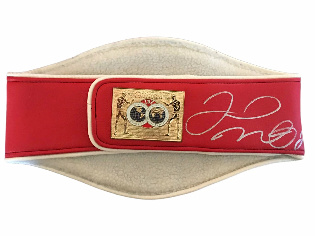 This Floyd Mayweather Jr., Full size IBF Championship Boxing Belt is Super Rare, This belt is Beautiful and heavy and has Gold color Face Plates. Hang it anywhere or Frame it? Make a great collection to you Boxing Championship Belt Memorabilia! Photo of signing, Also backed by iconsofboxing.com Guarantee.