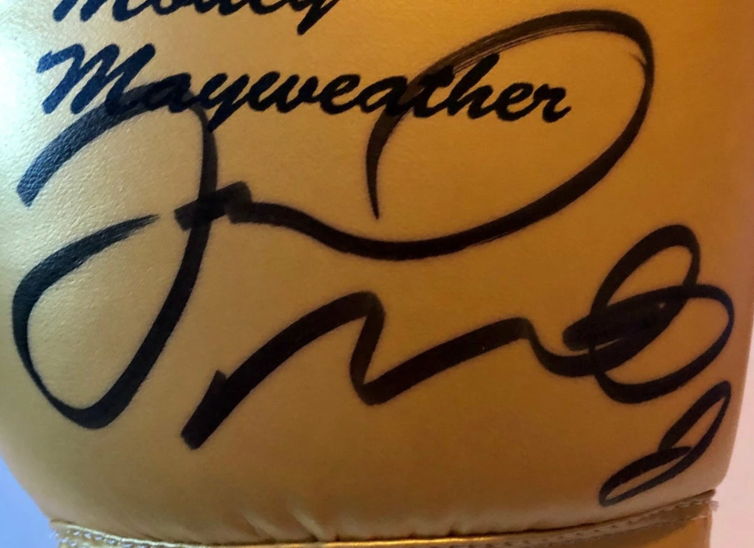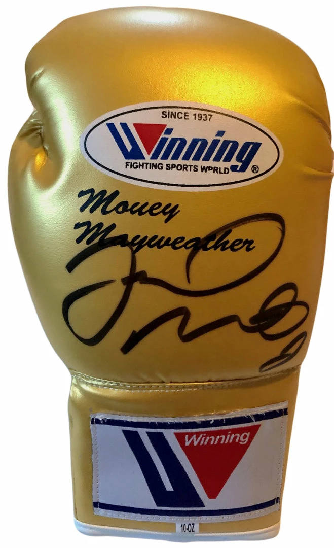 Floyd Mayweather signed autographed Winning Gold color Boxing Glove has been hand-signed in black felt-tip pen by Floyd Mayweather Jr. Authentic JSA full Letter.