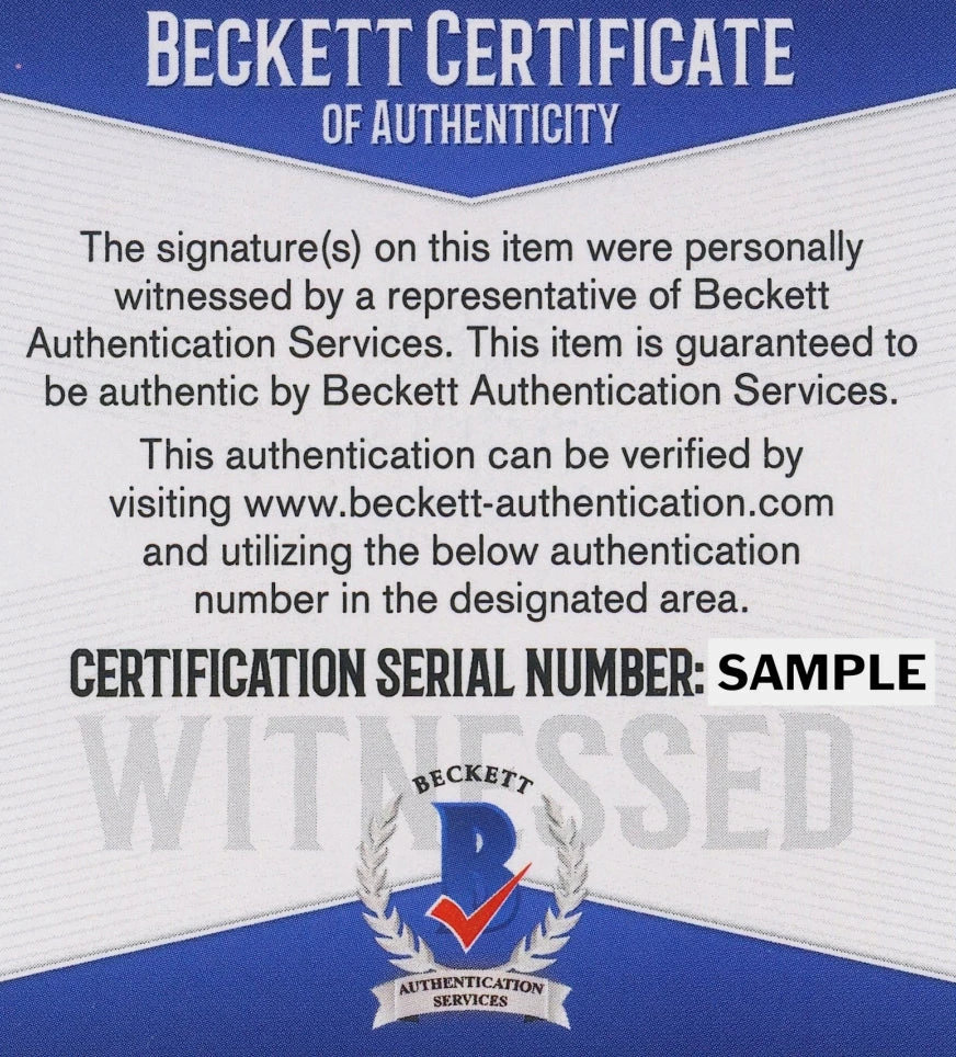The autograph includes an official Beckett Authentication Services serially numbered hologram and matching COA for authenticity purposes. The signing was witnessed by Beckett.