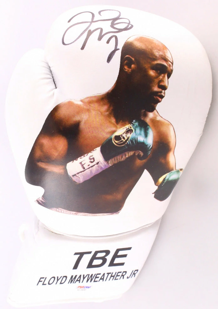 TBE photo boxing glove. Hand-signed in black felt-tip pen by Floyd Mayweather Jr.