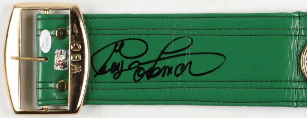 Full-size replica WBC Heavyweight Championship belt. The belt includes thick metal plates and faux leather. The belt has been hand-signed in black felt-tip pen by George Foreman.