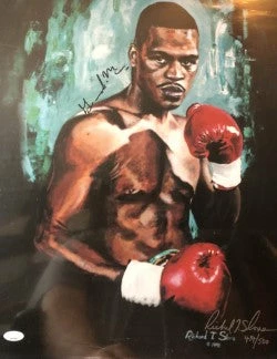 Gerald McClellan Autographed signed 16×20 Boxing Photo JSA CERT WBO Champ. This is an LIMITED EDITION piece that is a photo of an artist piece, and the artist signed it and so did G-Man sign the photo. Boxing photo that has been hand signed by Gerald McClellan. It has been witnessed being signed by us and his sister Lisa McClellan.