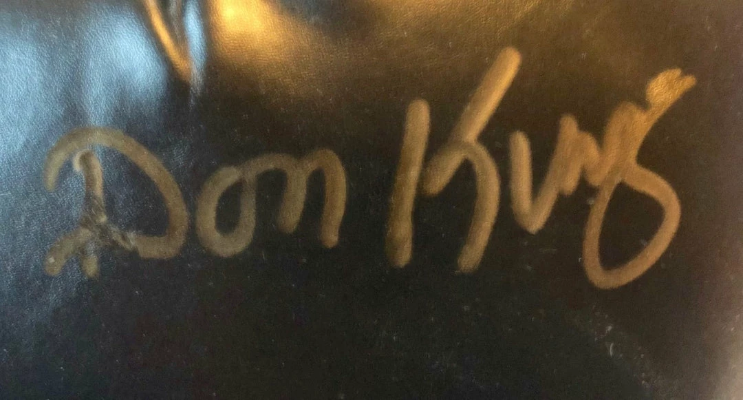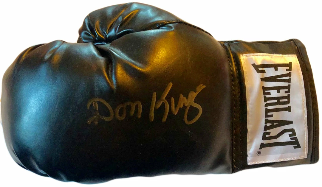 Hall of Famer Don King Autographed Black Everlast Boxing Glove with a Rare Gold Signature. Signed in the NY Boxing Hall of fame for us, we do have a relationship with Mr. King and we have photo’s to prove the signing in person.