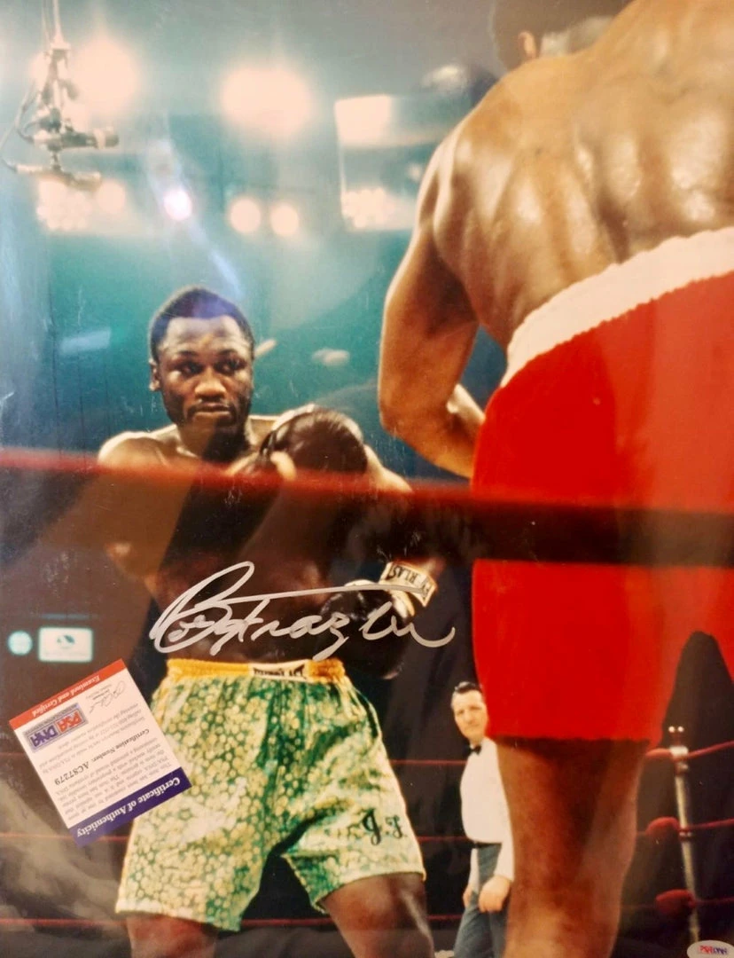 Smokin’ Joe Frazier signed Autographed 16 x 20 size photo. Comes From His daughters Collection! Making this a rare family piece. This is probably the Cream of the Crop in a Smokin’ Joe Frazier Autograph as Far as Size goes, A Huge Silver autograph by Frazier. And a very good Investment in his signature and in a Gigantic size photo. Retail Value may be in the up words of 1K Plus (Not Framed) This Piece is PSA/DNAl authenticated. JOE FRAZIER FAMILY COLLECTION!