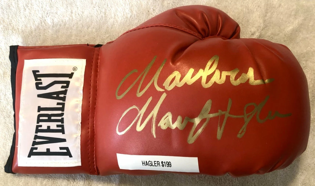 This glove has been personally hand-signed by Marvelous Marvin Hagler on a red Everlast Boxing Glove. Autographs Comes fully certified and tamper-evident hologram.