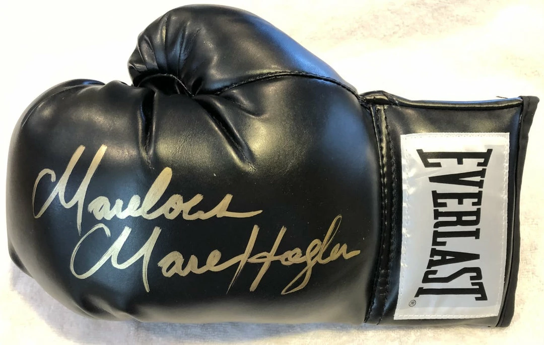 This glove has been personally hand-signed by Marvin Hagler Autographed signed black Everlast Boxing Glove in Gold Marker. Autographs Comes fully certified and tamper-evident hologram. Signed in person.