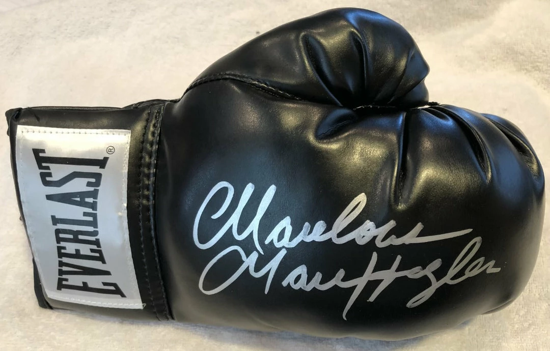 This glove has been personally hand-signed by Marvin Hagler Autographed signed black Everlast Boxing Glove in Gold Marker. Autographs Comes fully certified and tamper-evident hologram. Signed in person.