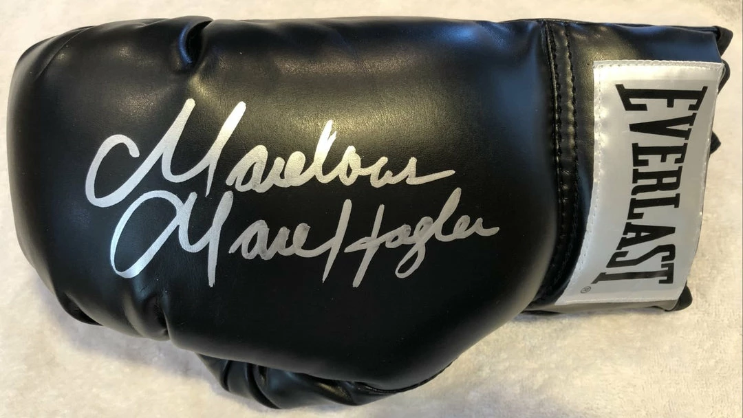 This glove has been personally hand-signed by Marvin Hagler Autographed signed black Everlast Boxing Glove in silver Marker. Autographs Comes fully certified and tamper-evident hologram. Signed in person.