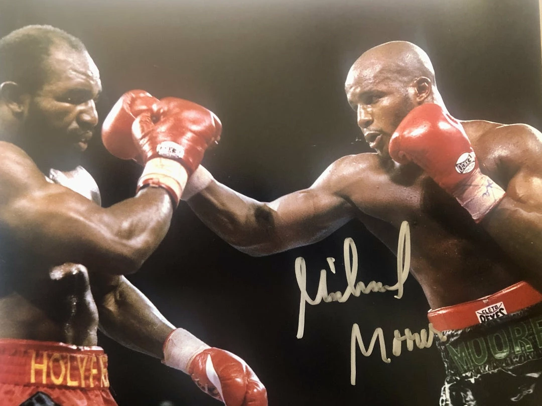 This Michael Moore Signed Autographed 8×10 boxing photo vs Evander Holyfield In Person. Signed In A Bold Silver Marker. Signatures may vary slightly if we have more than one of the same. Autographs Comes fully certified and tamper-evident hologram. Also backed by iconsofboxing.com