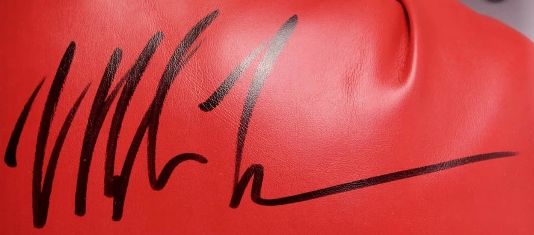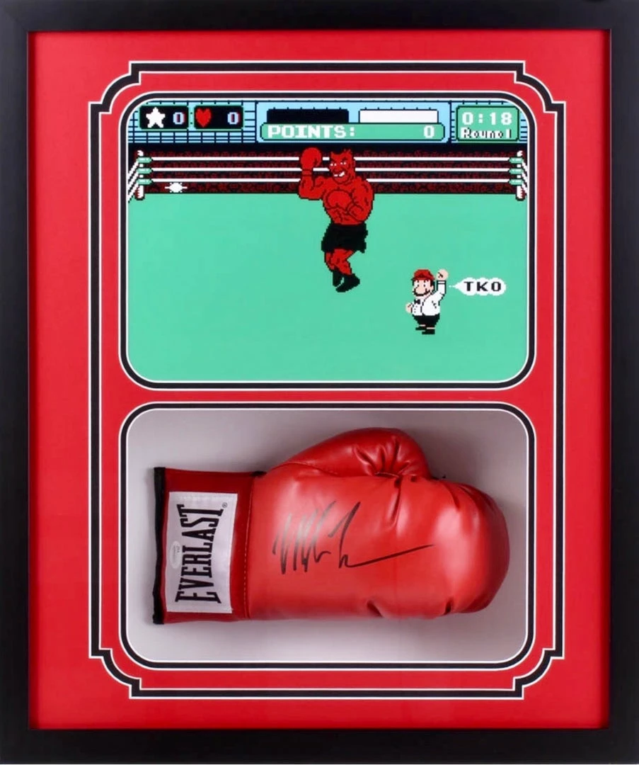 Shadowbox display measures approximately 22″ x 26″ x 5″ in size and features a glove which has been hand-signed in black felt-tip pen by Mike Tyson (HOF).