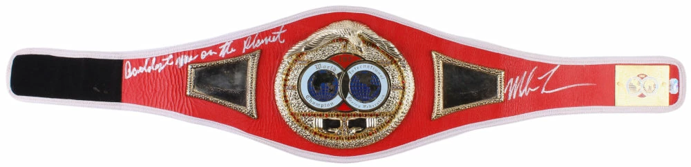 IBF Heavyweight Championship belt has been hand-signed and inscribed in silver paint pen by Mike Tyson (HOF).