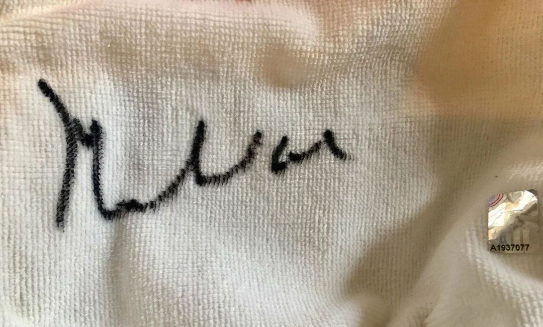 This Custom White Terry cloth Cassius Clay, Muhammad Ali Boxing Robe, has been personally signed by Ali himself and is Signed In black Marker. With a HUGE!!! Autograph Comes certified and tamper-evident hologram. Ali co certified, Also backed by iconsofboxing.com Authentic