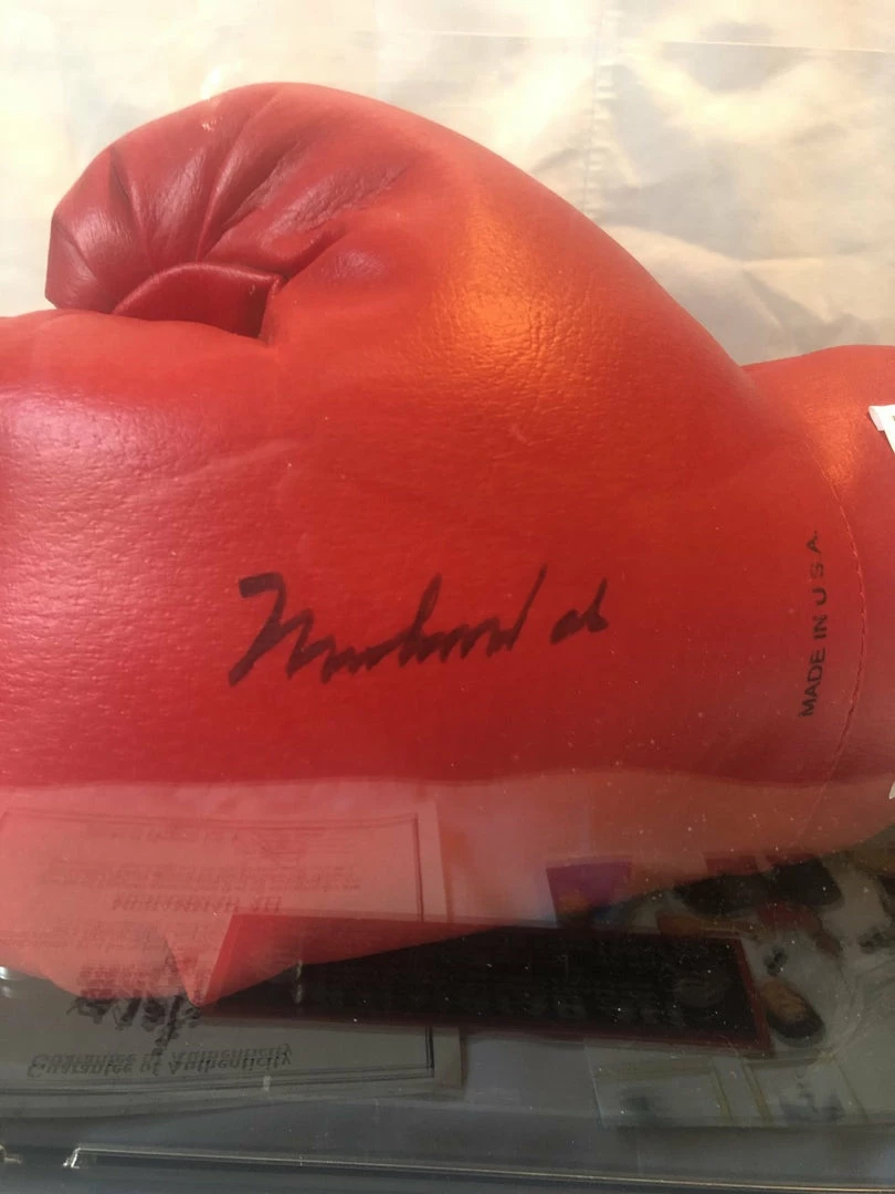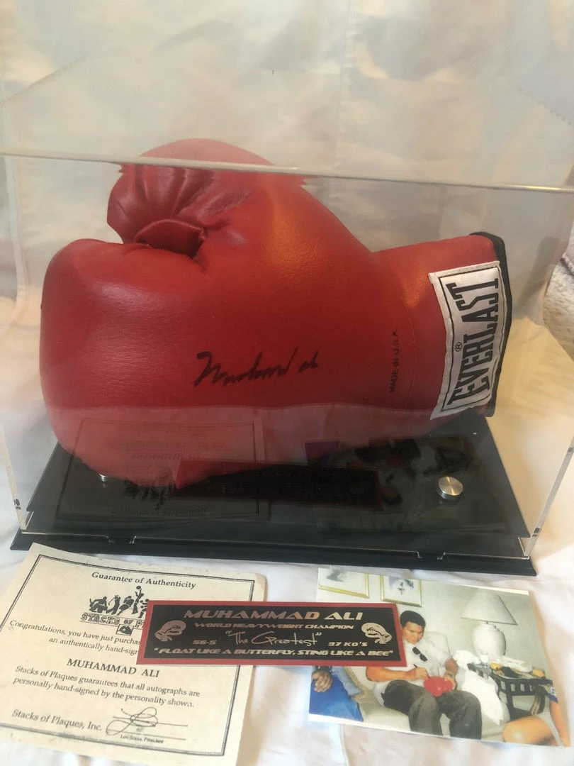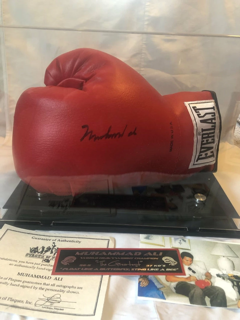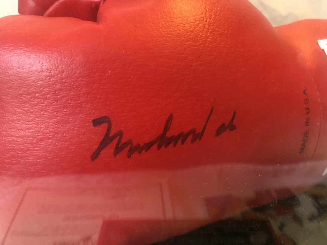 This Rare Vintage Everlast glove has been personally hand-signed by Muhammad Ali. Muhammad Ali Autographed Red Everlast Old Vintage Boxing Gloves, Auction House Autograph Comes fully certified with also photo of Ali signing these Gloves. Certificate of Authenticity and tamper-evident hologram. Also backed by iconsofboxing.com Authenticity Guarantee..