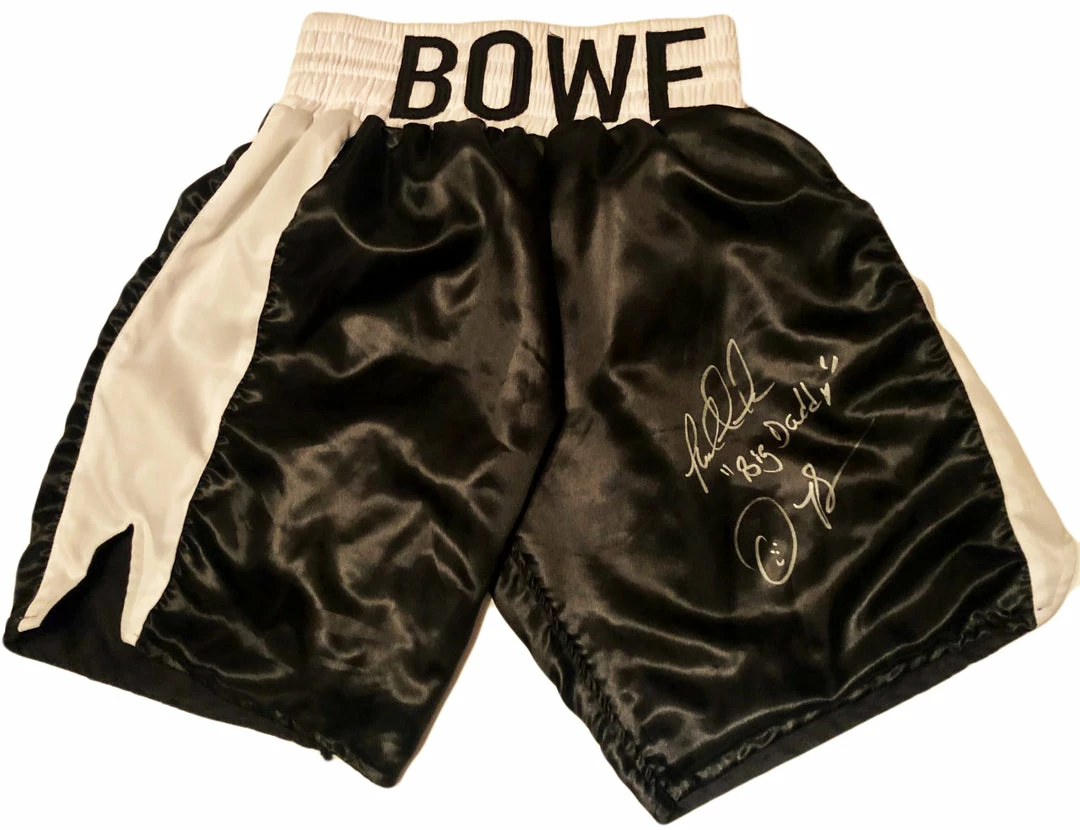 Riddick Bowe Autographed with inscriptions Everlast Boxing Black Trunks.