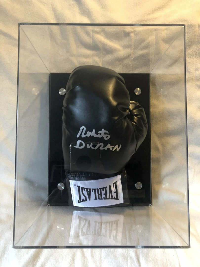 Iconsofboxing.com Roberto Duran Autographed Signed Everlast Blk/Silver Horizontal Boxing Gloves Display. TOP FIGHTERS