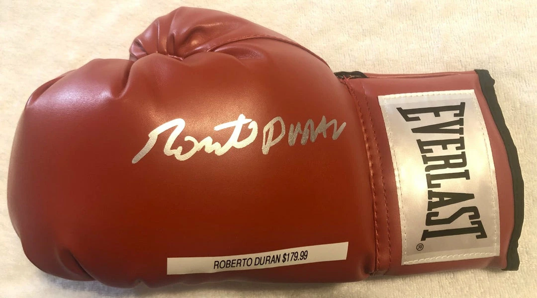 Iconsofboxing.com Roberto Duran Autographed Silver Signed Red Everlast Boxing Glove Large Signature