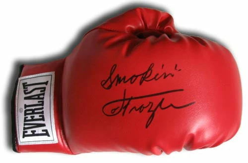 This glove has been personally hand-signed by Smokin Joe Frazier on a red Everlast Boxing Glove. Autographs Comes fully certified and tamper-evident hologram. Also backed by iconsofboxing.com Authenticity Guarantee.