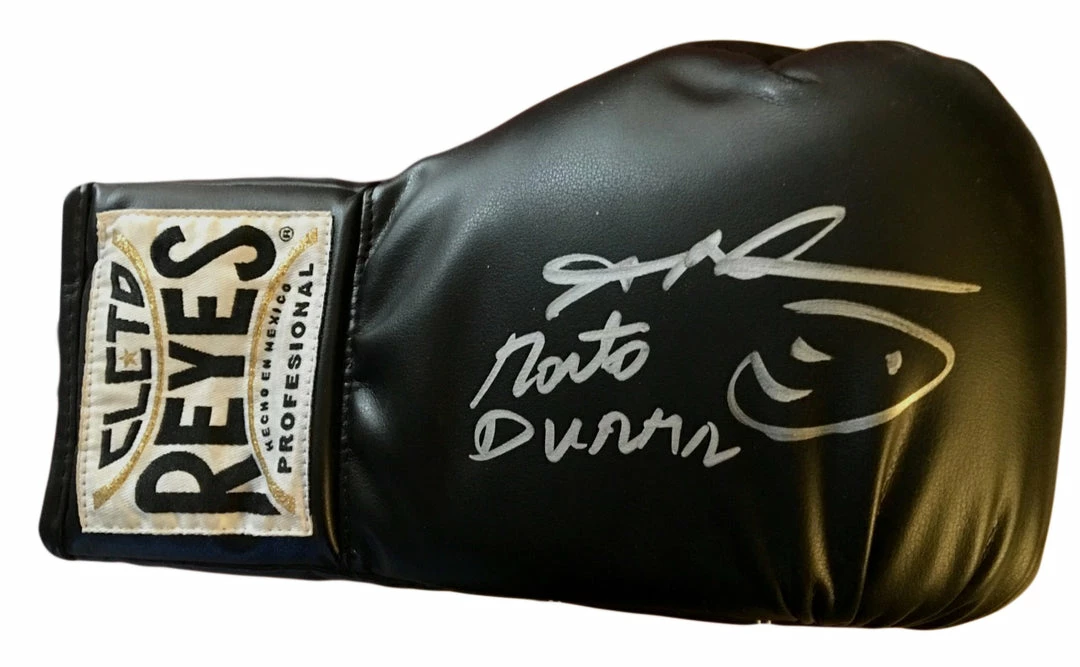 This glove has been personally Dual signed by Sugar Ray Leonard and Roberto Duran on a Black Reyes Boxing Glove. Signed In Silver Marker. Autographs Comes fully certified and tamper-evident hologram. Also backed by iconsofboxing.com Authenticity Guarantee.