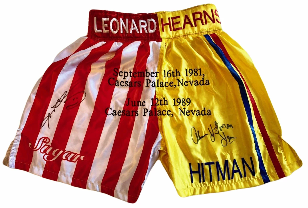 Iconsofboxing.com Sugar Ray Leonard And Tommy Hearns Custom Boxing Trunks Autographed In Black Signature