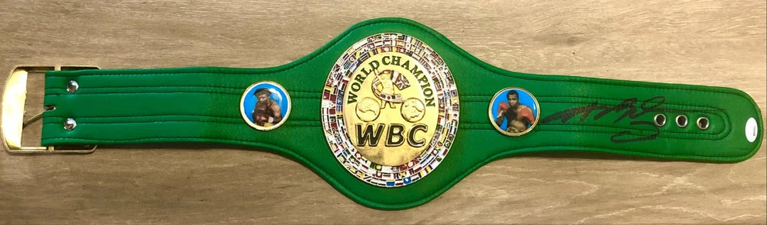 Sugar Ray Leonard Autographed Mini 31″ WBC Championship full Boxing Belt. Autographs Comes fully certified and tamper-evident hologram. Also backed by iconsofboxing.com Authenticity Guarantee.