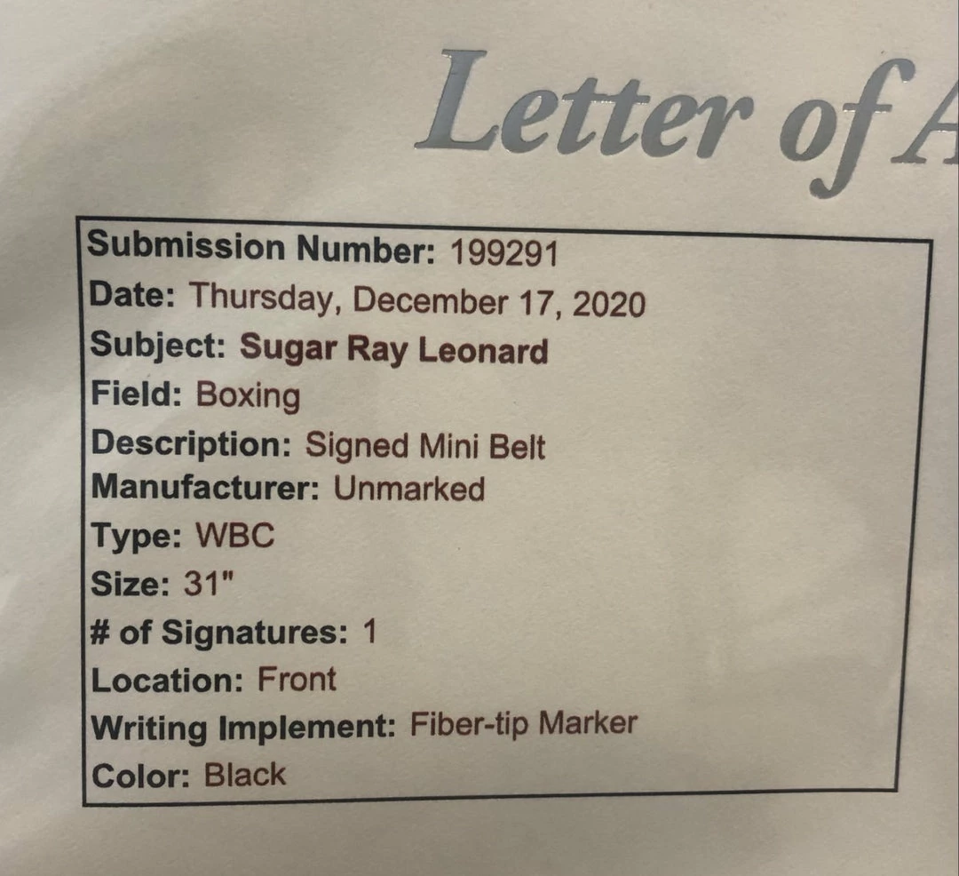 Iconsofboxing.com Sugar Ray Leonard Autographed MIni 31″ WBC Championship Full Boxing Belt TOP FIGHTERS
