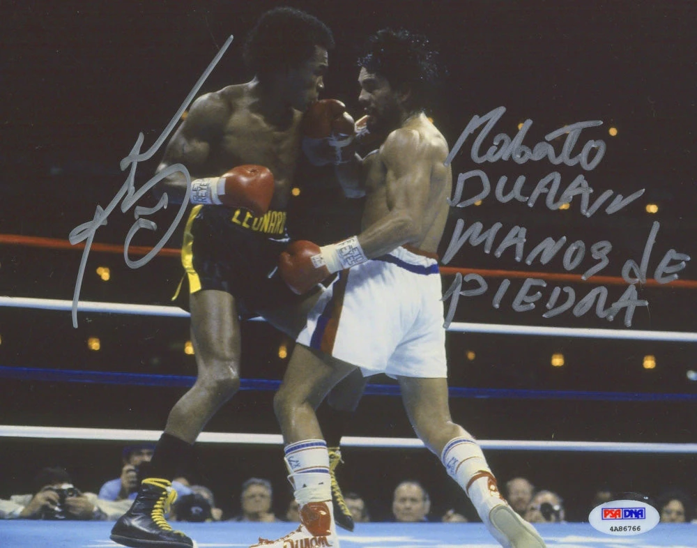 Photo measures 8″ x 10″ in size and has been hand-signed and inscribed in silver paint pen by Sugar Ray Leonard and Roberto Duran.