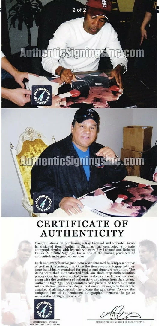Photo measures 16″ x 20″ in size and has been hand-signed By both fighters, Sugar Ray Leonard and Roberto Duran.
