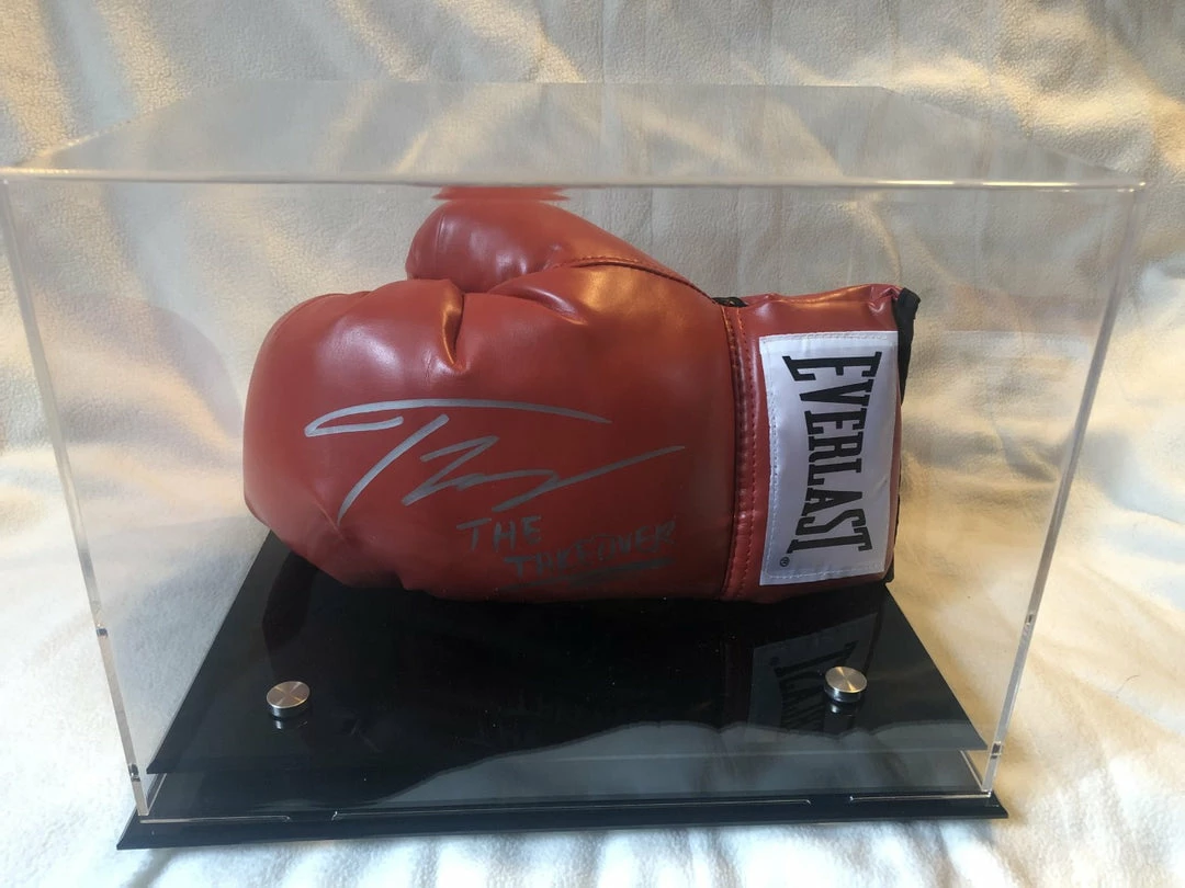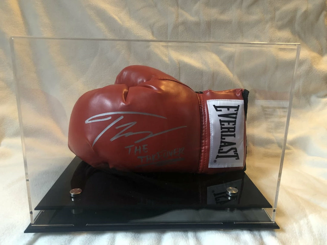 Horizontal Tiofimo Lopez autographed signed Everlast Red/Silver boxing gloves. This Everlast red/Silver edition gloves comes in our ultra new design display case. ready to lay on any surface or hang on any wall. iconsofboxing.com suggested limited Edition investment pieces!